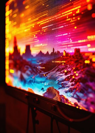 A striking image of a computer screen displaying a graphic design software interface, with vibrant colors and shapes being manipulated in real-time