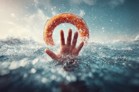 A close-up view depicts a hand emerging from churning water, reaching towards a floating life preserver. The scene showcases a dynamic composition with splashing water and an orange ring. The dramatic lighting suggests a challenging environment, suitable for various editorial and commercial applications. The image evokes a sense of struggle and rescue.