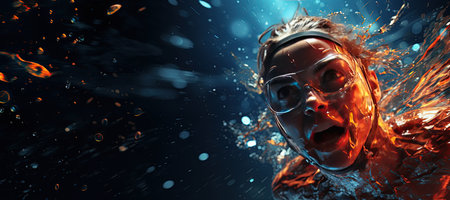 A swimmer floats peacefully, their face adorned with glowing ripples and golden waves. The ethereal light creates a magical underwater ambiance, enhancing the serene moment.