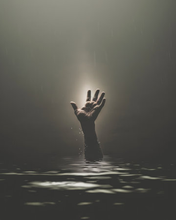 A haunting image of a solitary hand rising from a fog-covered body of water, creating a surreal and mysterious atmosphere that invites introspection and emotion.