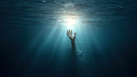 An evocative underwater scene of a hand reaching towards the light, evoking feelings of hope and escape. The vibrant blue and sun rays create a striking, dramatic visual perfect for concepts of freedom, resilience, and peace.