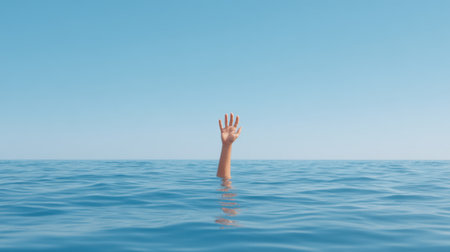 A solitary hand emerges from the serene waters, symbolizing a quest for help and connection amidst vast ocean tranquility and expansive blue sky.
