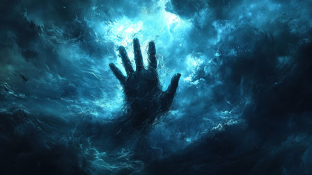 A haunting image of a hand reaching out from turbulent ocean waves and dark clouds, evoking emotions of mystery, fear, and isolation against a surreal backdrop.