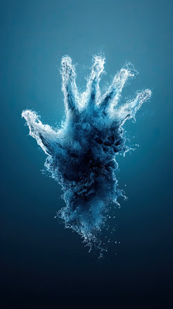 An image shows a human hand submerged in water, with droplets suspended around it. The photograph captures a close-up view with a shallow depth of field, showcasing the hand's texture and the water's movement. This visual may be used for various projects related to nature, well-being, or concepts such as freedom and serenity.