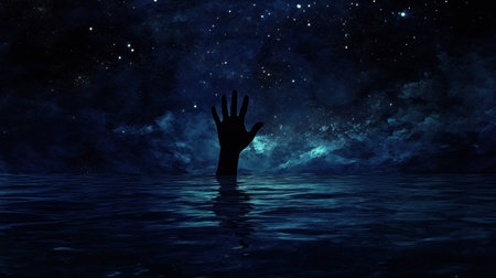 A chilling image of a lone hand reaching out from dark waters at night, under a starry sky, pleading for rescue