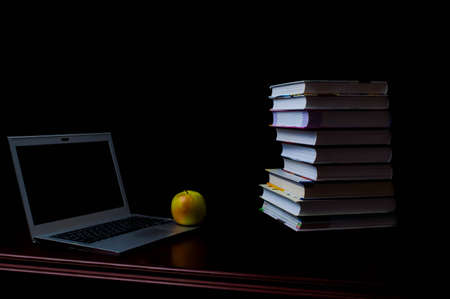 An open laptop on the table near the stack of books. Place for your text.