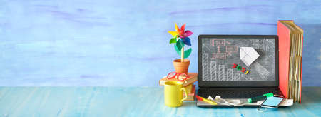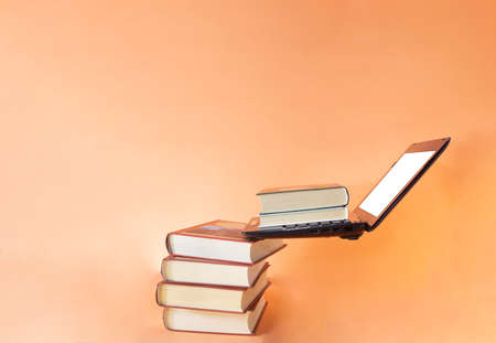 Laptop computer with colored books study, library, technology, online, computer