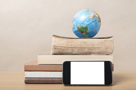 book and earth ball with smart phone on wood background