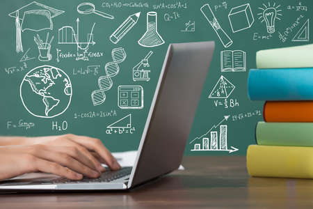 Hands of woman typing on laptop in blurry room with creative and bright online education icons on screen. Concept of e learning during coronavirus covid 19 pandemic. Toned image