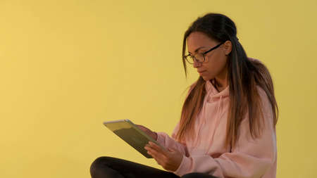 Black woman in eyeglasses working on tablet on yellow background. She sitting on the floor.