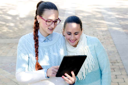 Two women using a tablet while Smiling