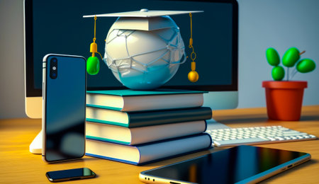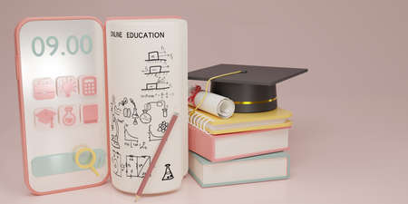 3D Rendering of Graduation Cap, books and mobil phone on light orange background. Realistic 3d shapes. Education online concept.