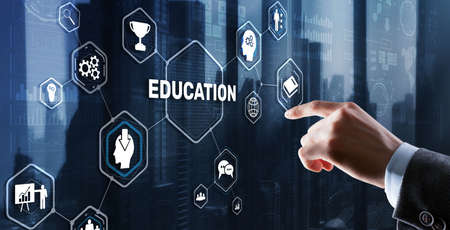 E-learning Online learning distance education concept. Businessman pressing button on screen.