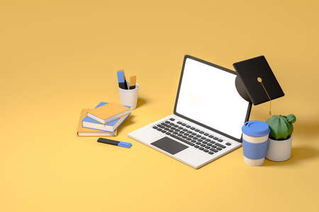 E-learning concept with laptop and wifi symbol surrounded by Graduate cap, open books, balloon, Ruler,statistical graph, pencil and magnifying glass on blue and yellow color tone 3d render