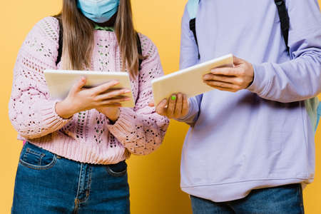 Cropped view of teenage girl in medical mask holding digital tablet near friend on yellow background
