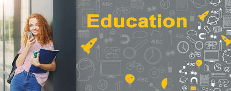 Education Concept. Happy Student Girl Using Smartphone Standing With Backpack Outdoors. Collage With Icons And Text, Panorama