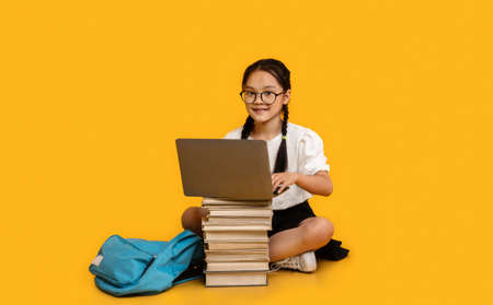 Asian Little Girl Doing Homework On Laptop Sitting At Book Stack Posing Over Yellow Studio Background. Online Learning Concept