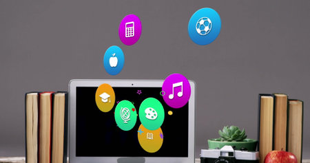 Image of colorful icons over laptop on desk. Global social media, icons and digital interface concept digitally generated image.