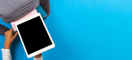 Kid hands taking digital tablet computer from gray backpack over light blue background. Top view