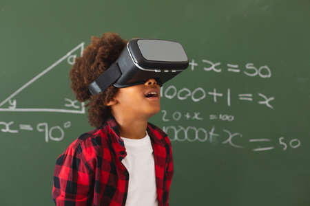 African american schoolboy in front of chalkboard in classroom using vr headset. childhood, technology and education at elementary school.