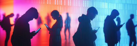 Several people bow their heads, engaged with their smartphones, surrounded by vibrant digital codes, illustrating a sense of isolation.