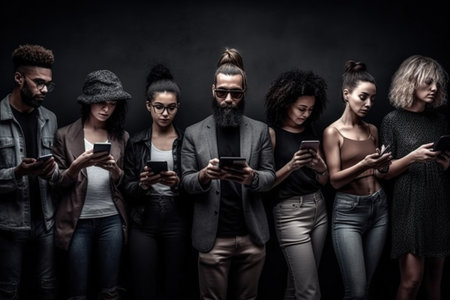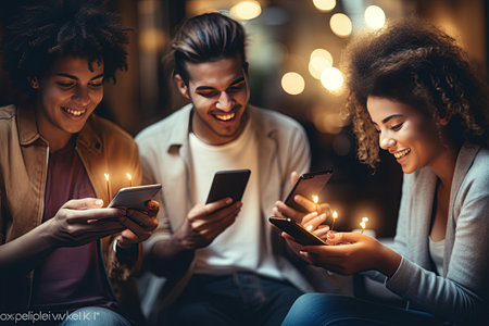 group of friends having fun while using their smartphones to share content on social media networks.Generated with AI