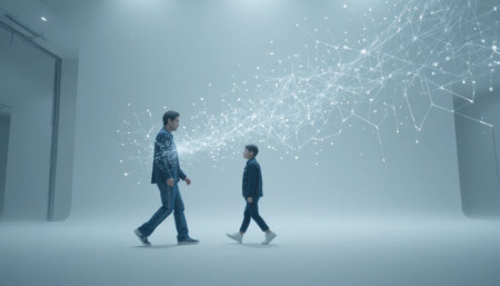 A man and a child stand in a light-filled studio, connected by glowing lines. They observe the light patterns.