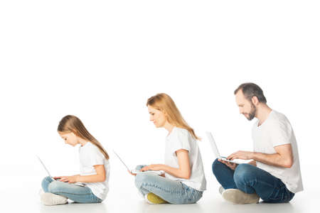 side view of family sitting on floor with laptops on crossed legs isolated on white