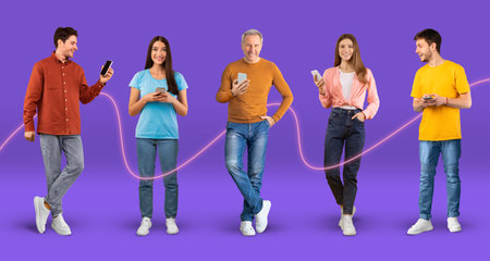 Happy young, adult european people in casual typing on smartphones with connect line