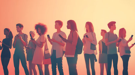 A diverse group of individuals standing in silhouette, engaged with their smartphones against a colorful sunset backdrop.