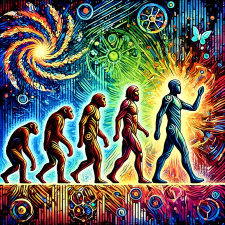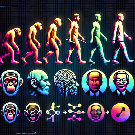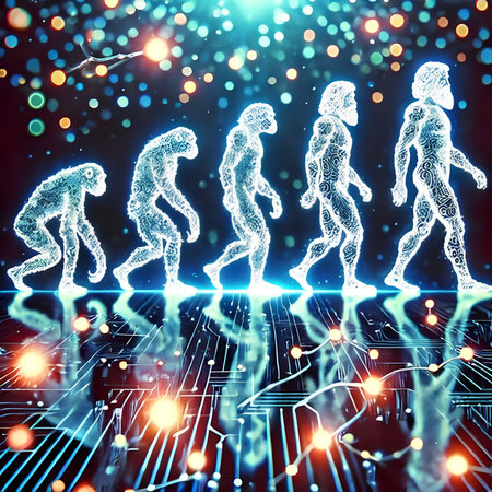 An illustration depicts the evolution of humans, culminating in a connection with technology. The figures progress against a dark backdrop, transitioning from primitive forms to a technologically integrated being. The composition showcases a stylized, conceptual representation, suitable for editorial and commercial applications.