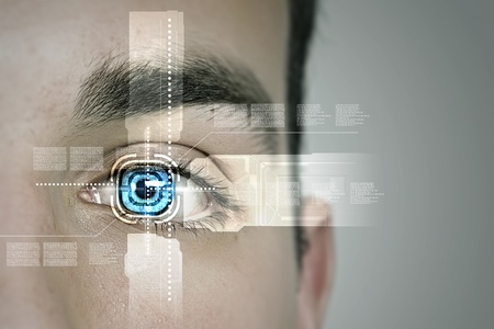 Close-up of a male eye with visual effects. The concept of a sensor implanted in the human eye. business, computer, cyberspace
