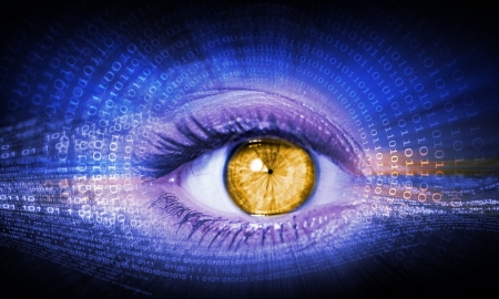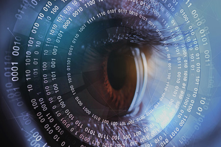 A close-up of a human eye with a glowing blue digital iris formed by binary code and circuit patterns