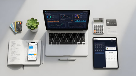 Neatly arranged work-from-home desk for cryptocurrency or forex trading, including business essentials and technology devices