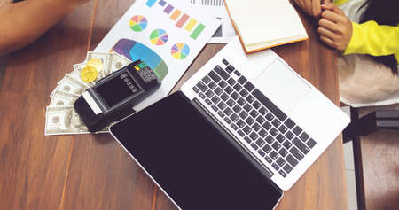 accounting concept. business people working with paper work. computer notebook and cash on table at office workplace