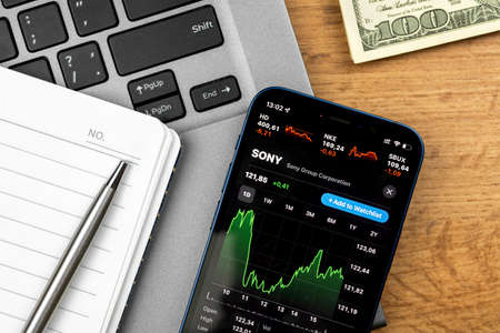 Kharkov, Ukraine - December 1, 2021: Sony stock trade with mobile phone. Business desktop, investment online concept
