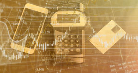 Image of financial data processing over credit card terminal smartphone and credit card. global finances, business and contactless payment concept digitally generated image.