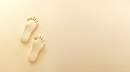 Two footprints are imprinted in soft sand, suggesting a peaceful beach walk on a bright and sunny day.