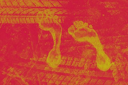 Road tire and the human track on the road in color. Background texture, pattern of red and yellow. Texture design of tires and legs. A footprint of a man's and machine's feet.
