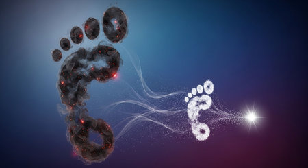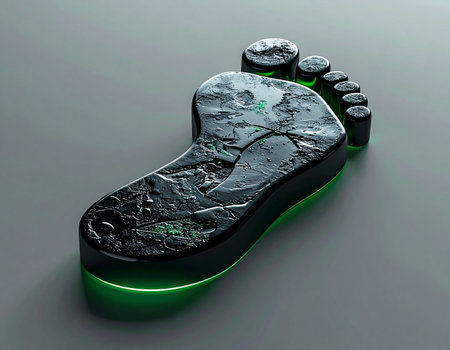 A 3D rendering of a technological footprint glows with green energy, symbolizing the lasting impact of our digital lives. This conceptual image represents the intersection of technology, data, privacy, and environmental responsibility, illustrating the permanent mark left by innovation and progress in the modern world.