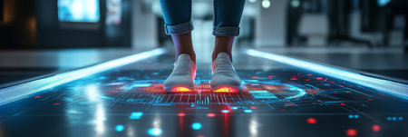 Person on Illuminated Futuristic Foot Analysis Mat with Digital Technology for Health