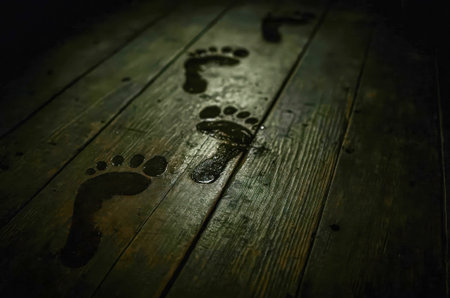 Series of wet, barefoot footprints on an old wooden floor in dim lighting, creating a haunting and mysterious trail.
