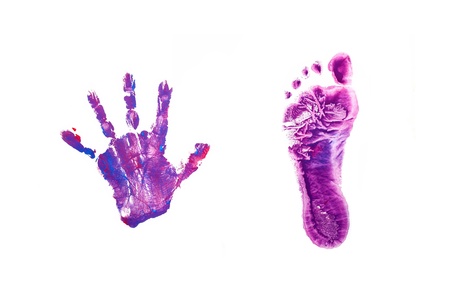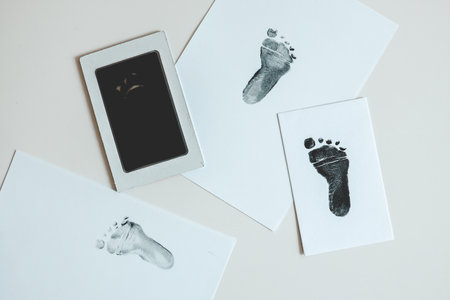 Baby footprints on white paper. Black footprint. The process of creating a baby footprint.