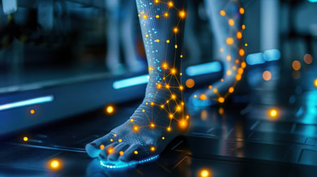 This image showcases human feet integrated with high-tech visuals, representing the fusion of technology and biology in a modern context.