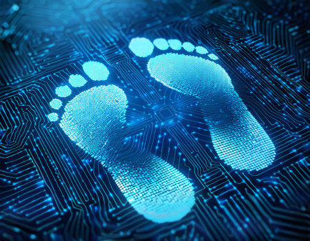 A captivating digital representation of a footprint glowing in blue, set against a cyber-themed background. This image symbolizes identity and technology's impact on security.