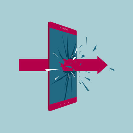The arrow penetrates the smartphone. Isolated on blue background.