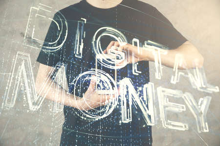 Double exposure of mans hands holding and using a phone and crypto currency blockchain theme drawing.
