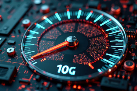 Futuristic circuit board with speedometer displaying 10g connectivity in vibrant red and blue. That the image is generated using AI.