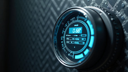 Close-up view of futuristic clock face displaying the year 2025 prominently
