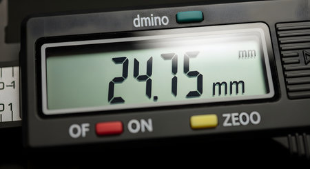 A close-up macro shot of the LCD screen on a digital caliper, displaying a precise measurement of 24.75 millimeters. The image emphasizes accuracy, engineering, and the use of modern measuring tools in a workshop or laboratory. The buttons for power and zeroing are also visible.